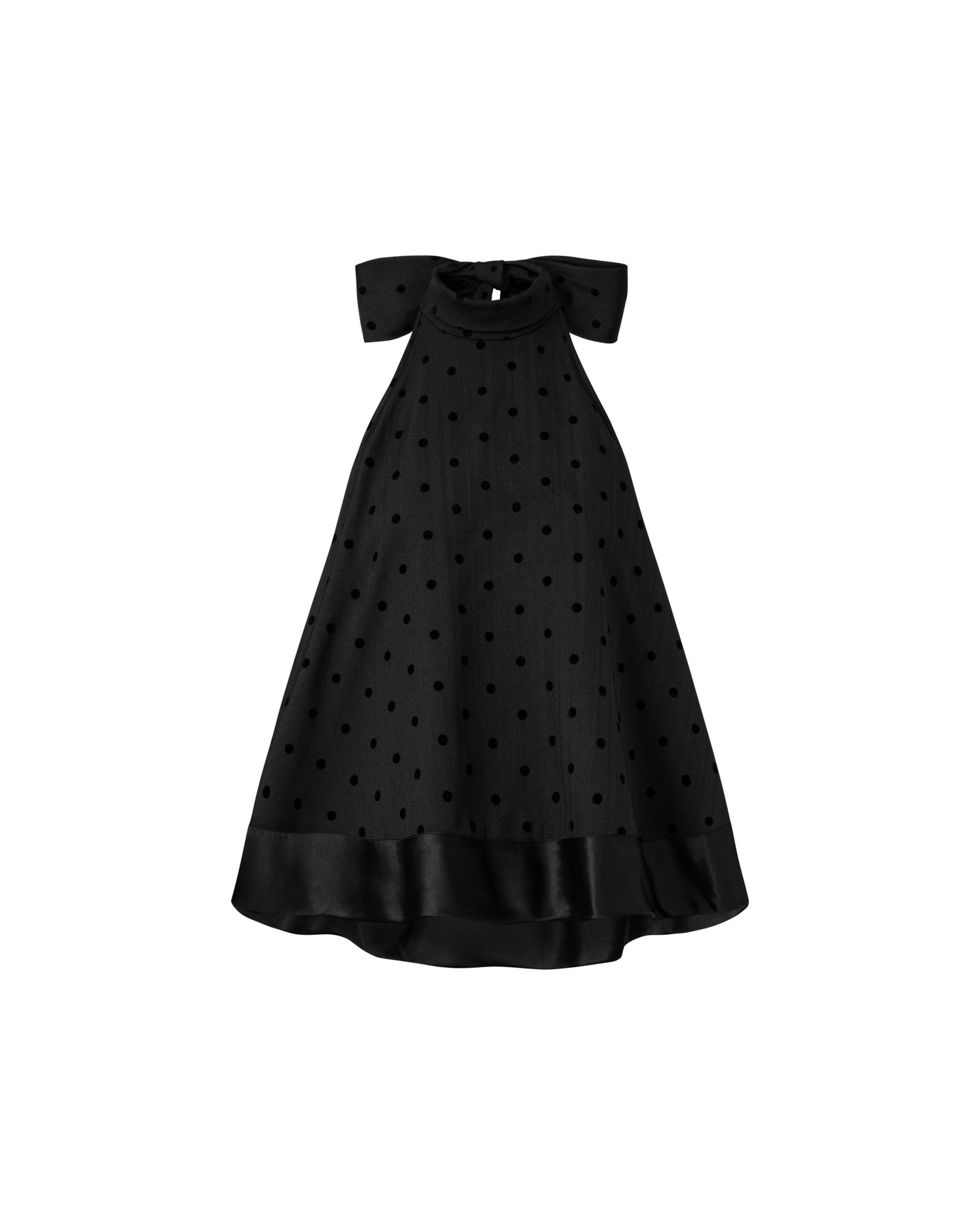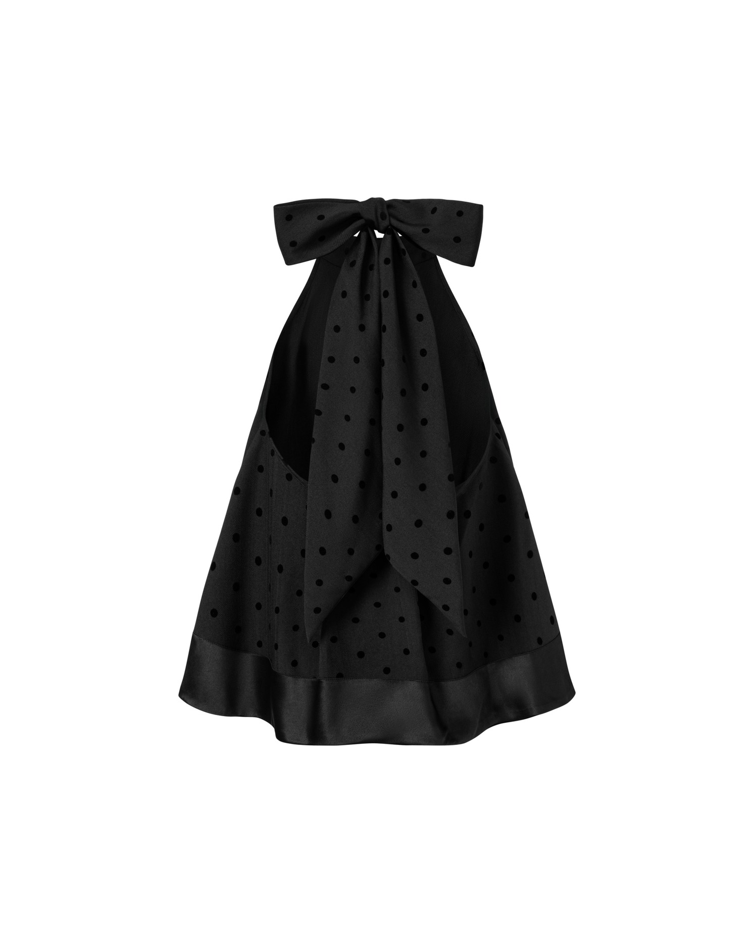 - Polka-dot halter top with a flared silhouette, creating a light and feminine shape.