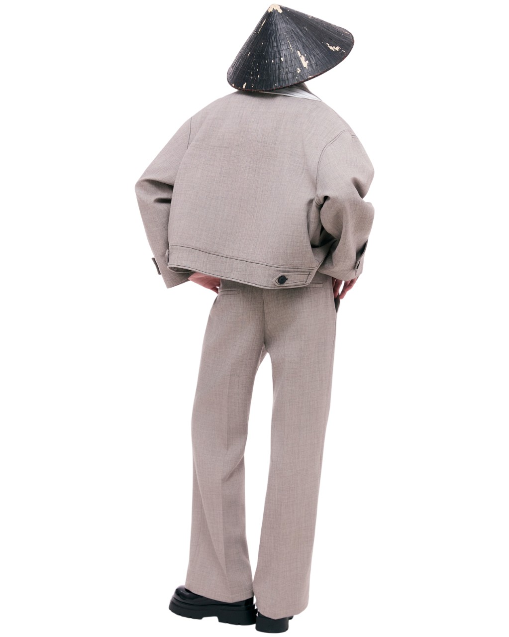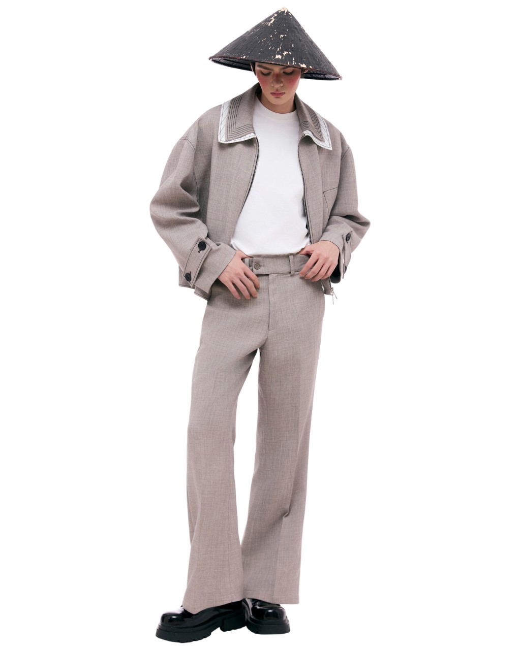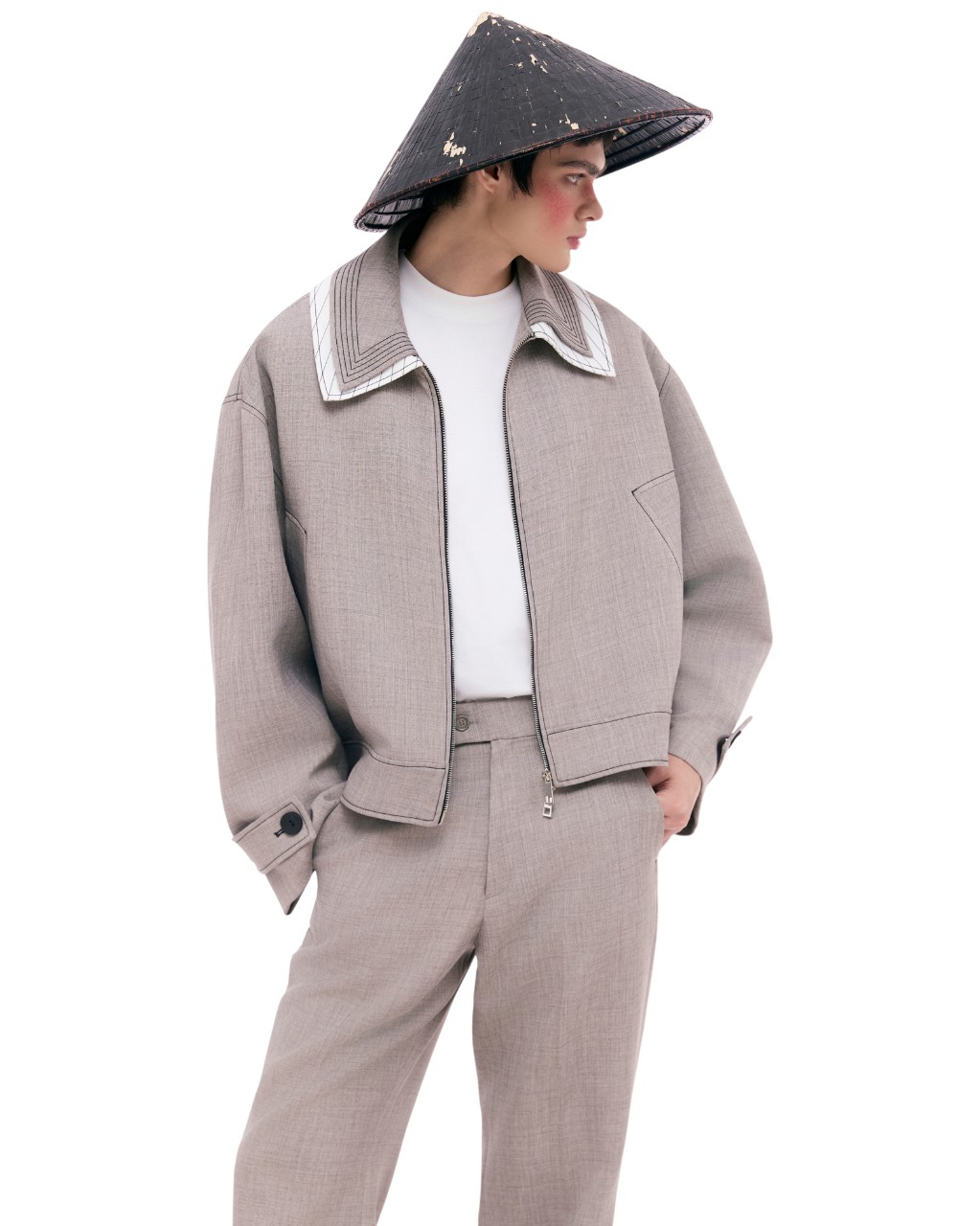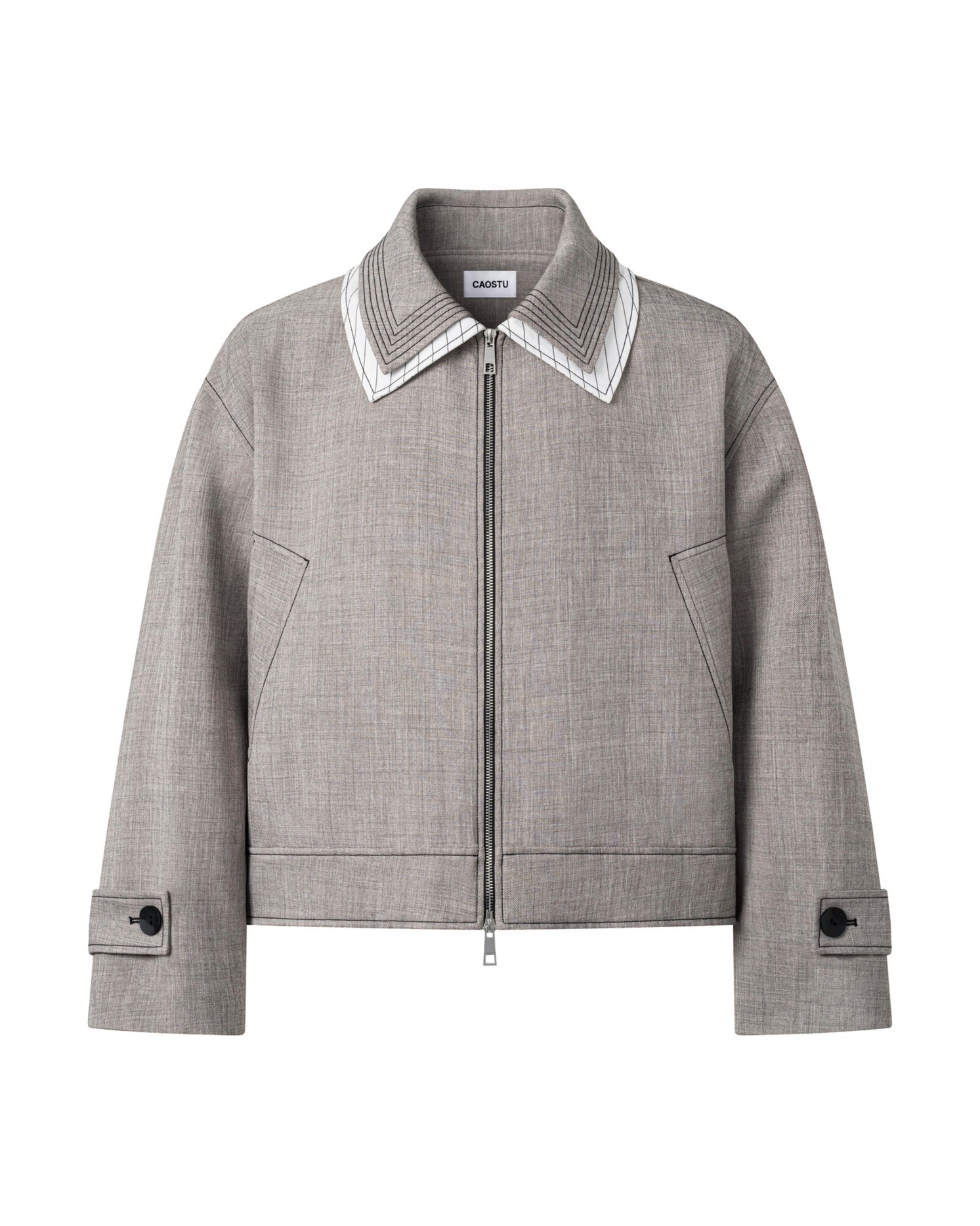 - Grey collar with contrast topstitching layered over a white striped collar, creating a modern visual contrast
