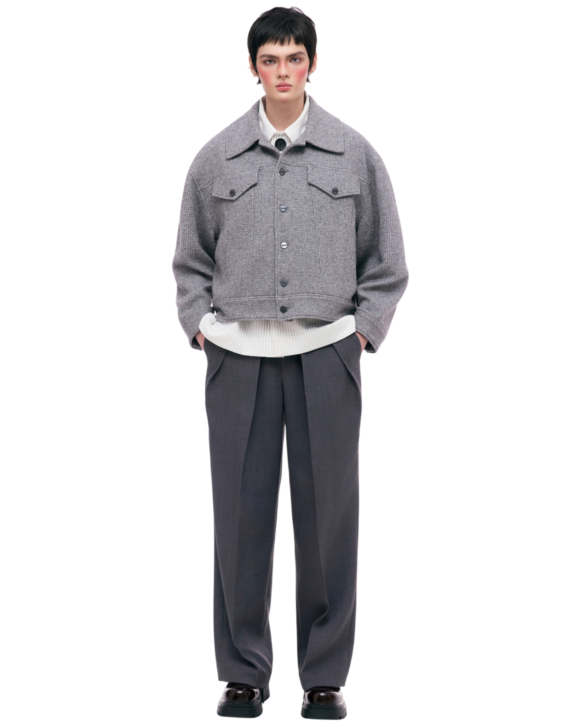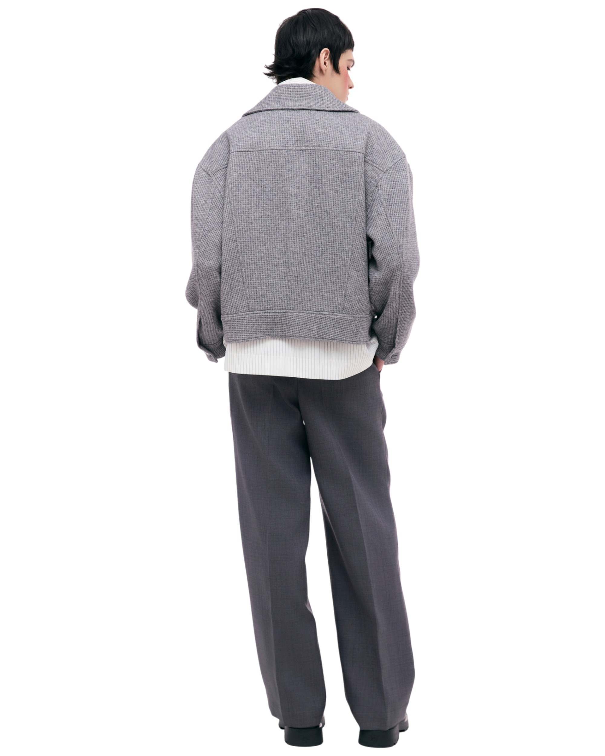 - Crafted from small-check woven wool fabric, creating subtle surface texture and warmth