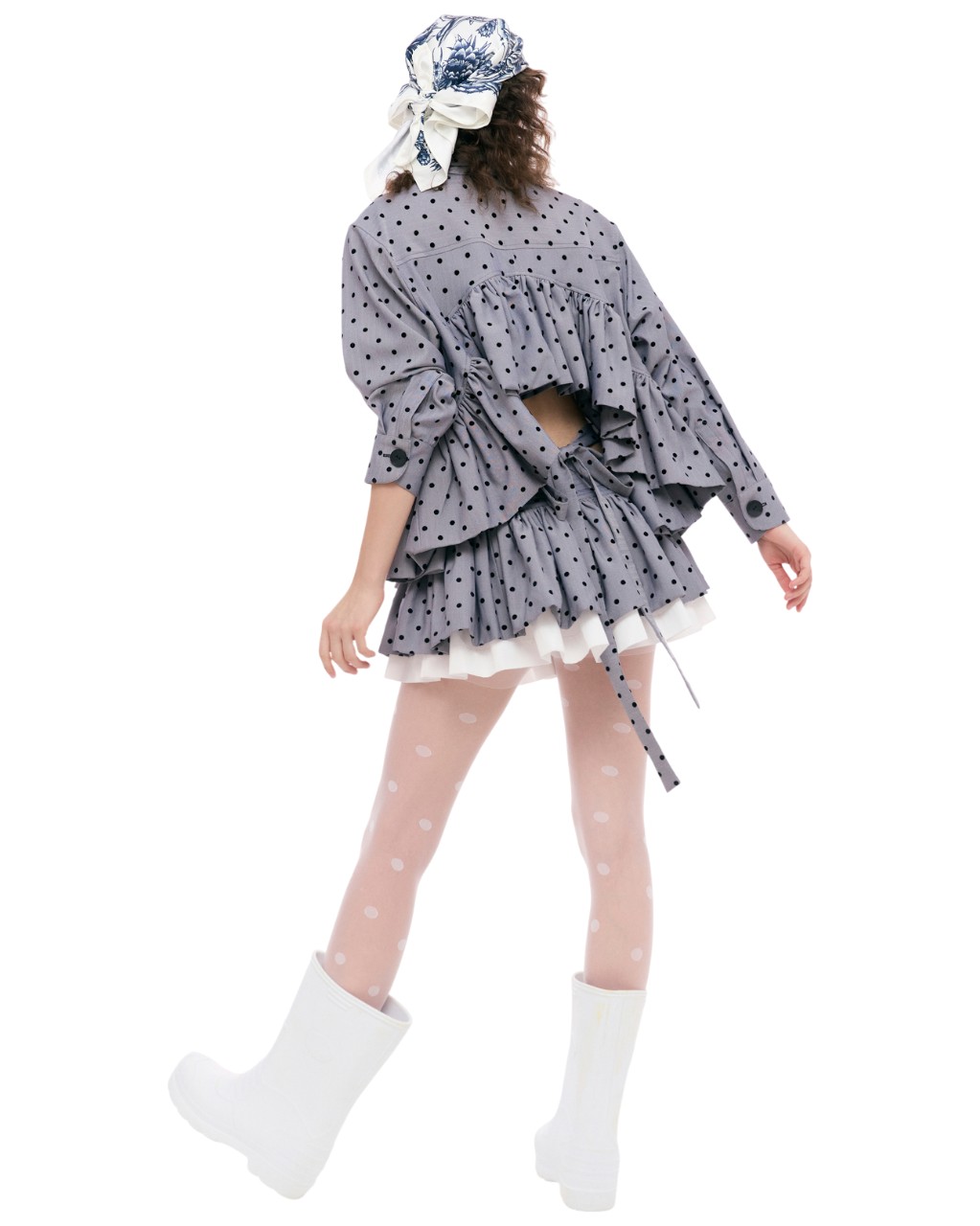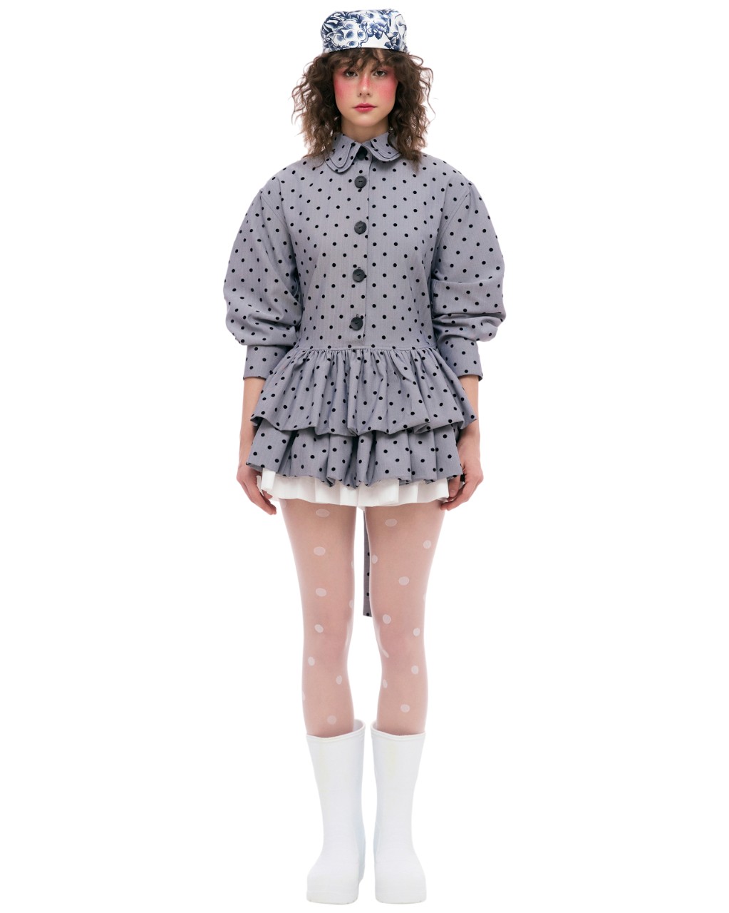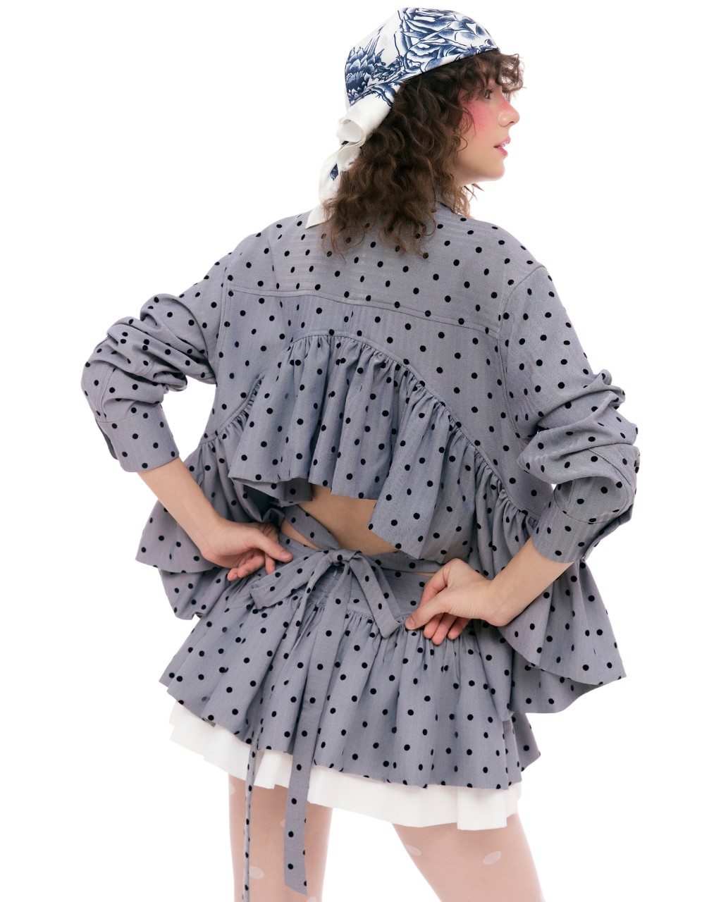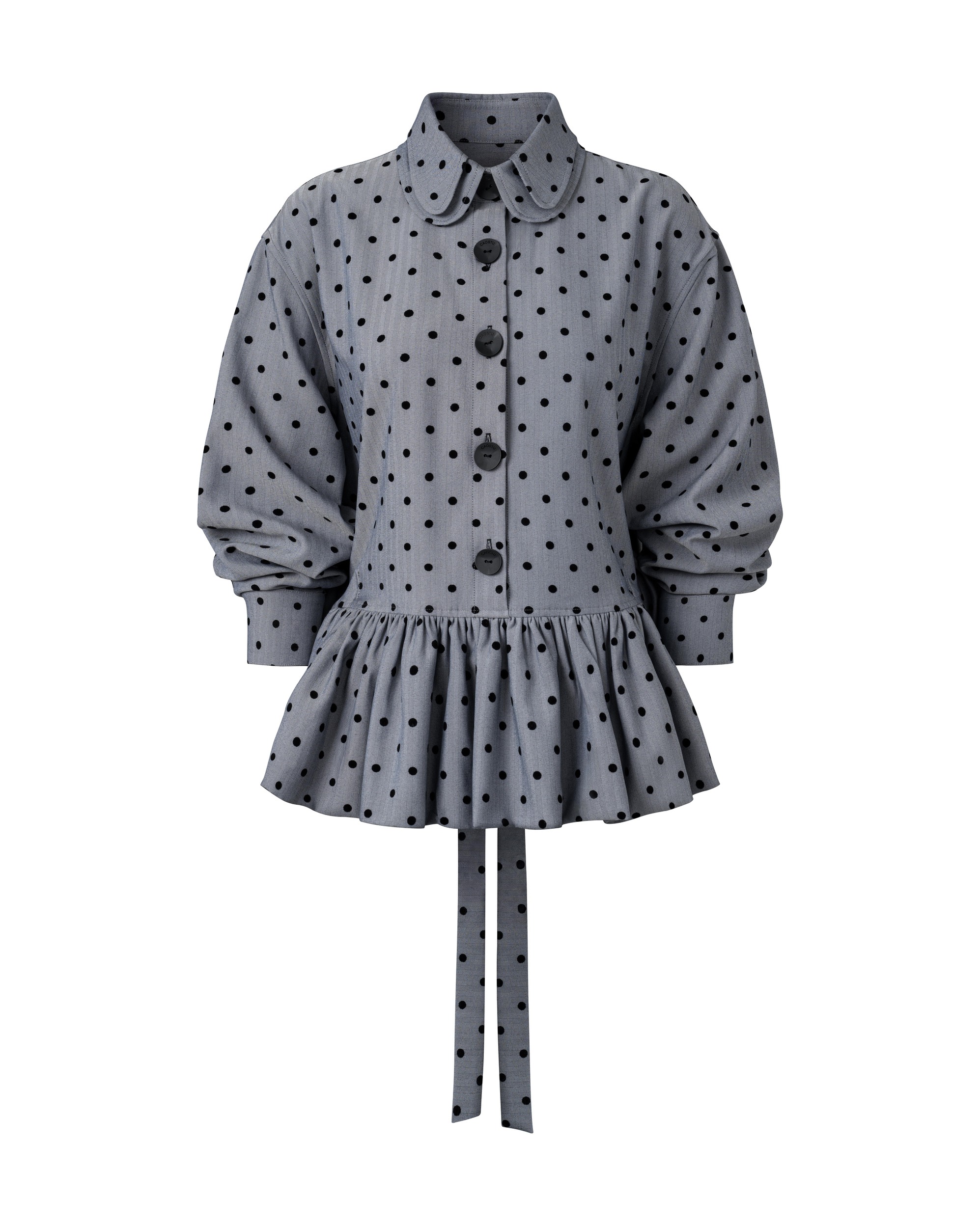 -  Babydoll shirt crafted from silk–cotton with a playful polka-dot pattern.