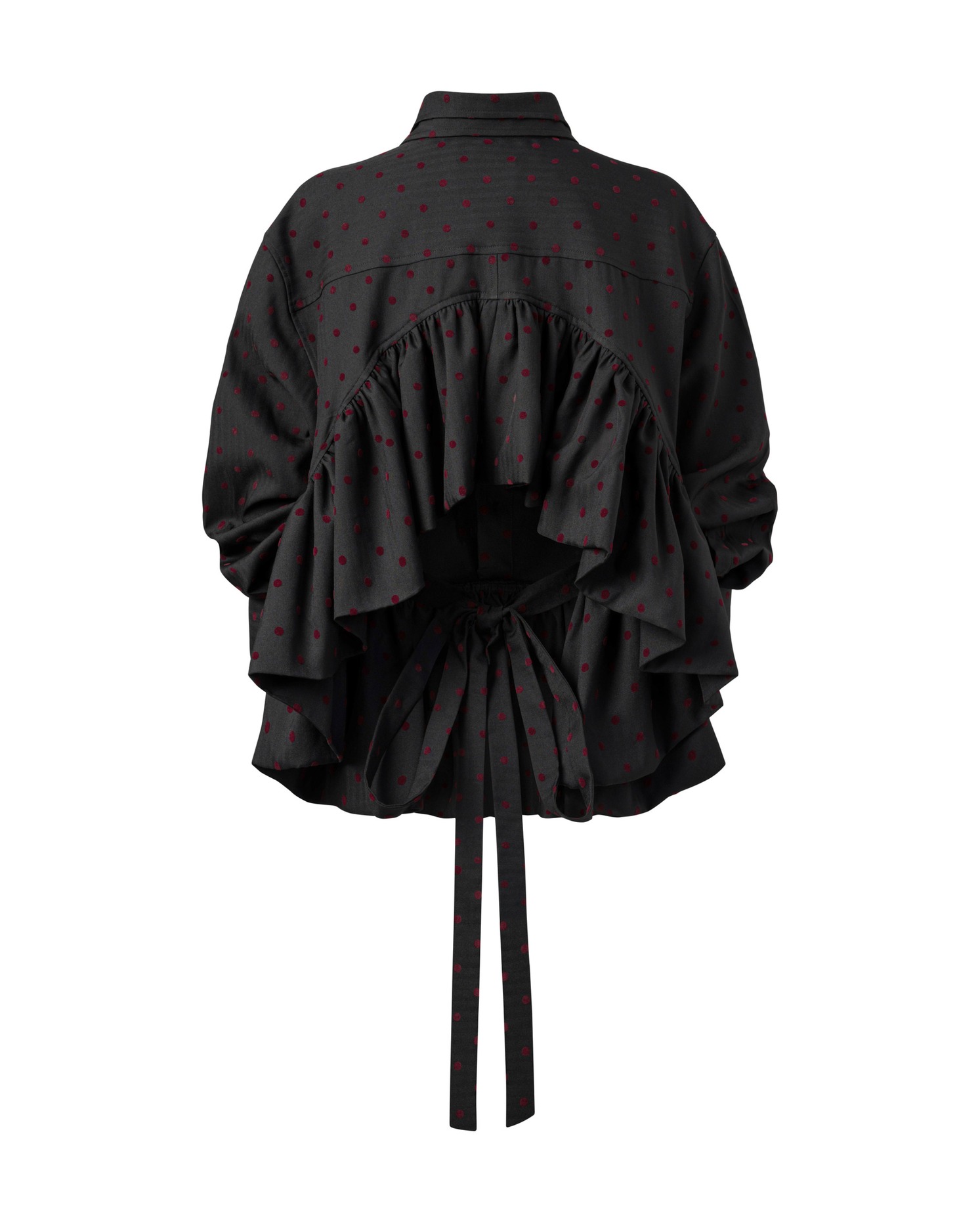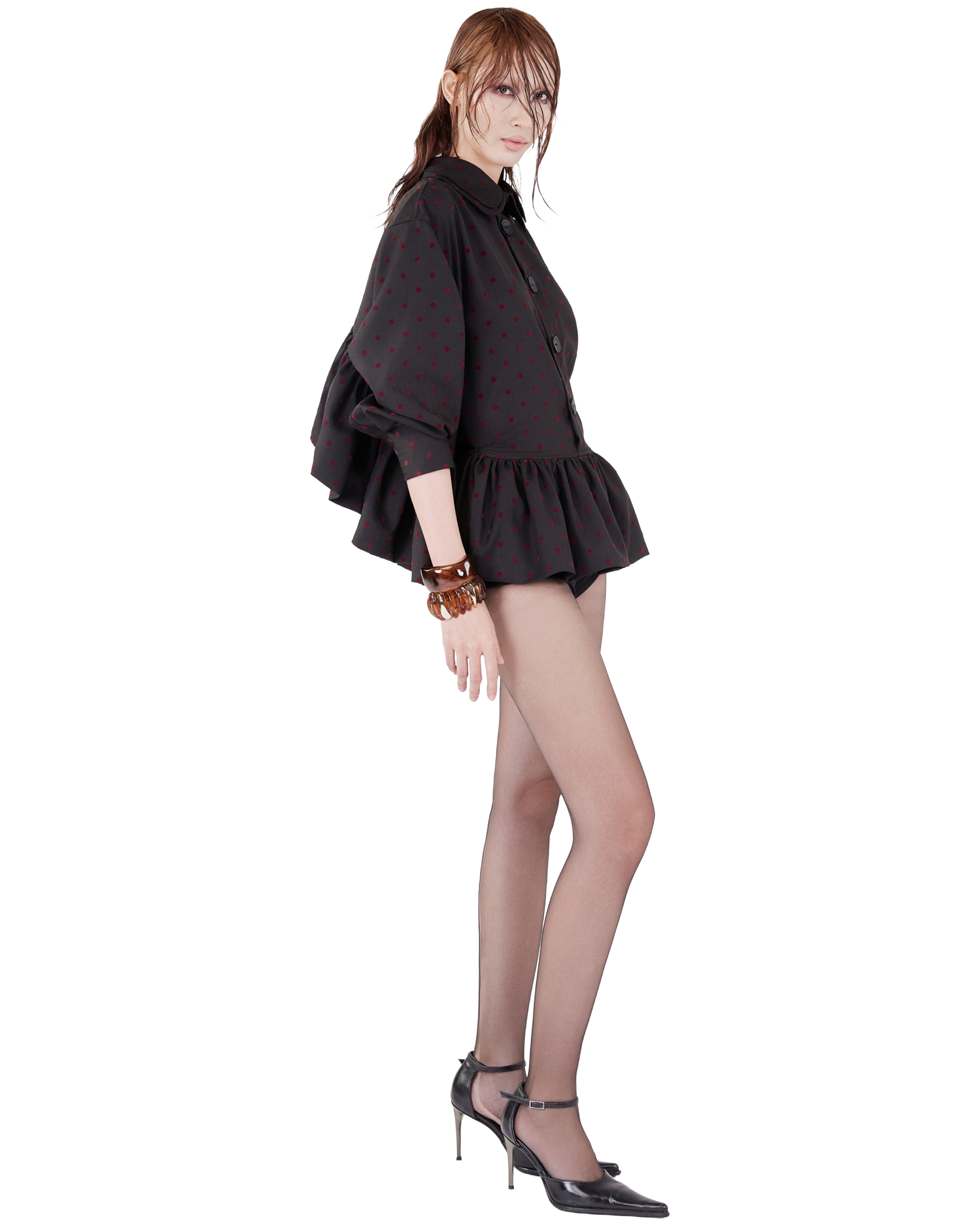 - Babydoll shirt crafted from silk–cotton with a playful polka-dot pattern.