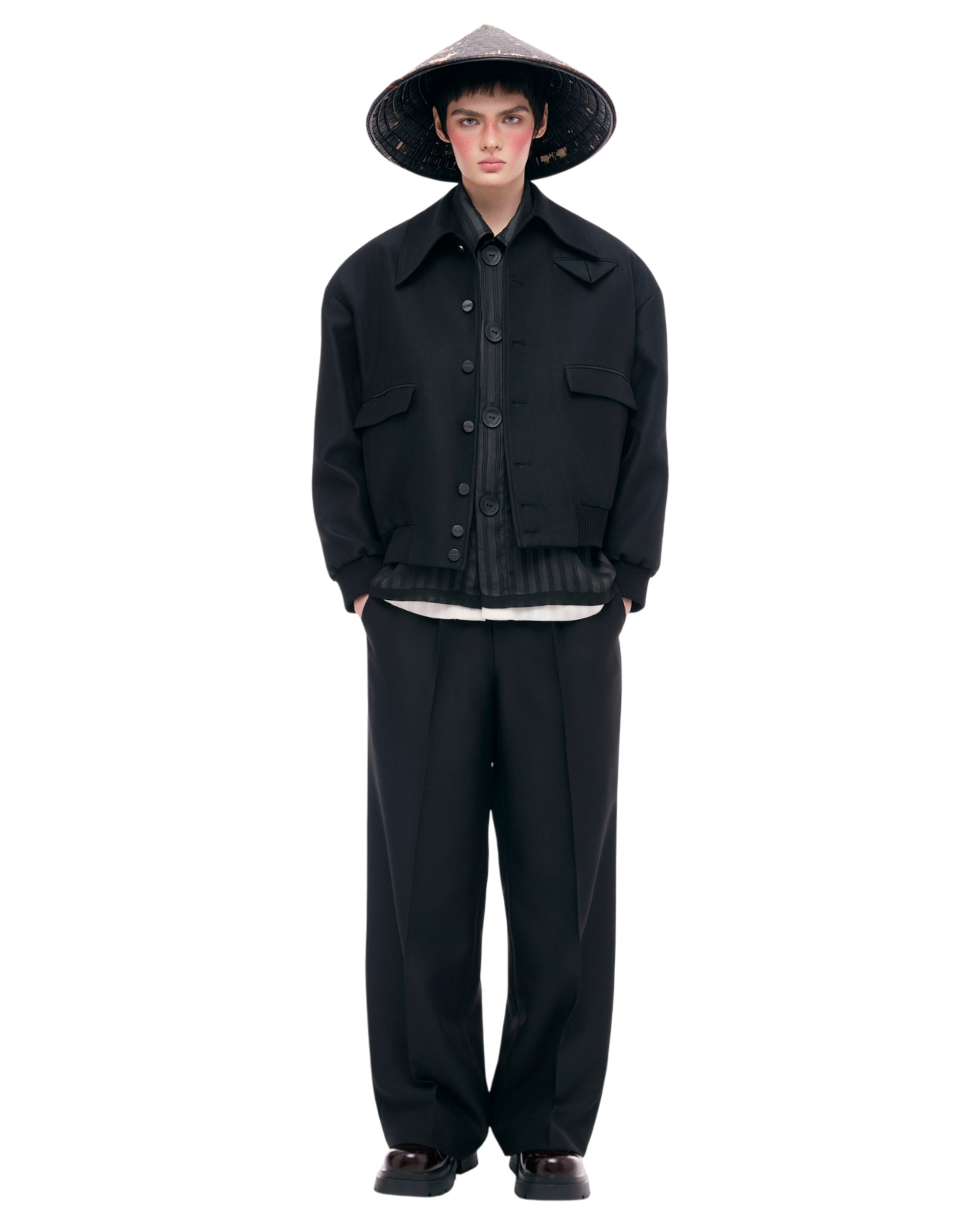 - Oversized collar paired with metal buttons embossed with the CAOSTU logo