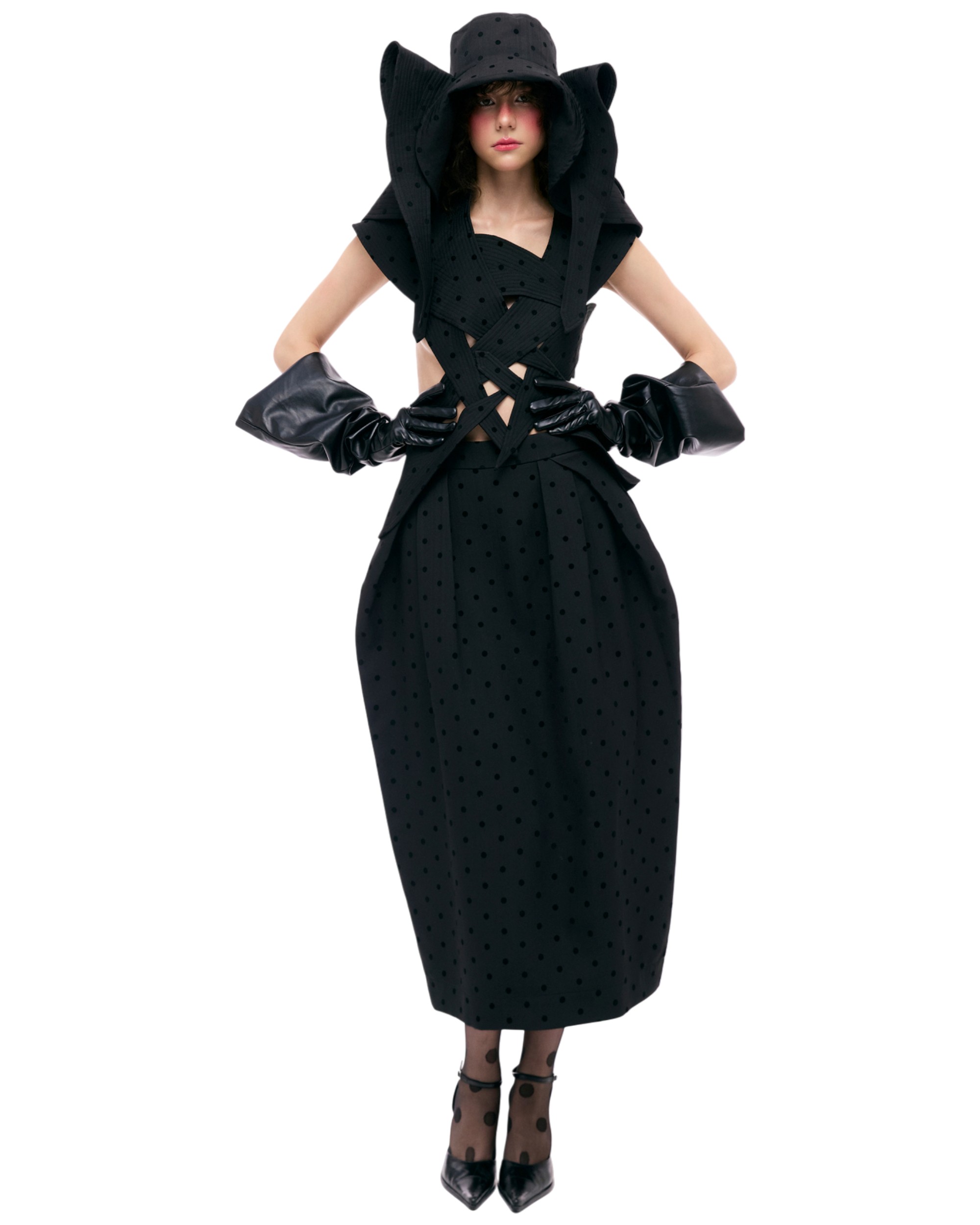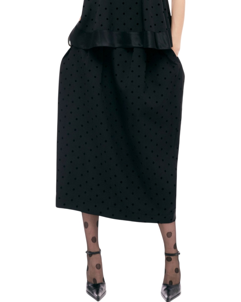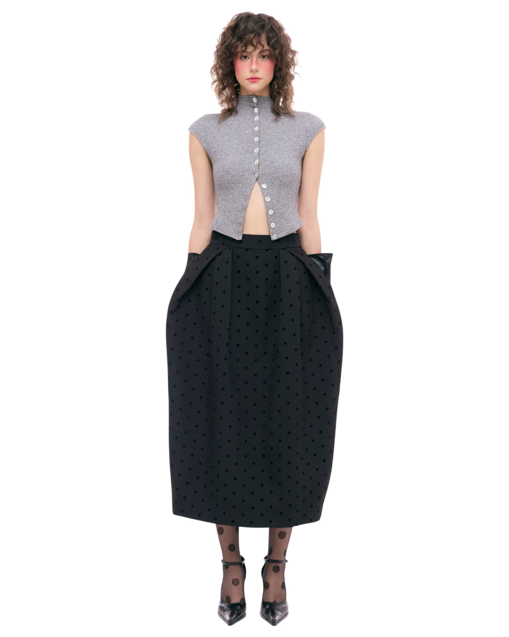 - Design focuses on front pleating, creating gentle volume at the hips