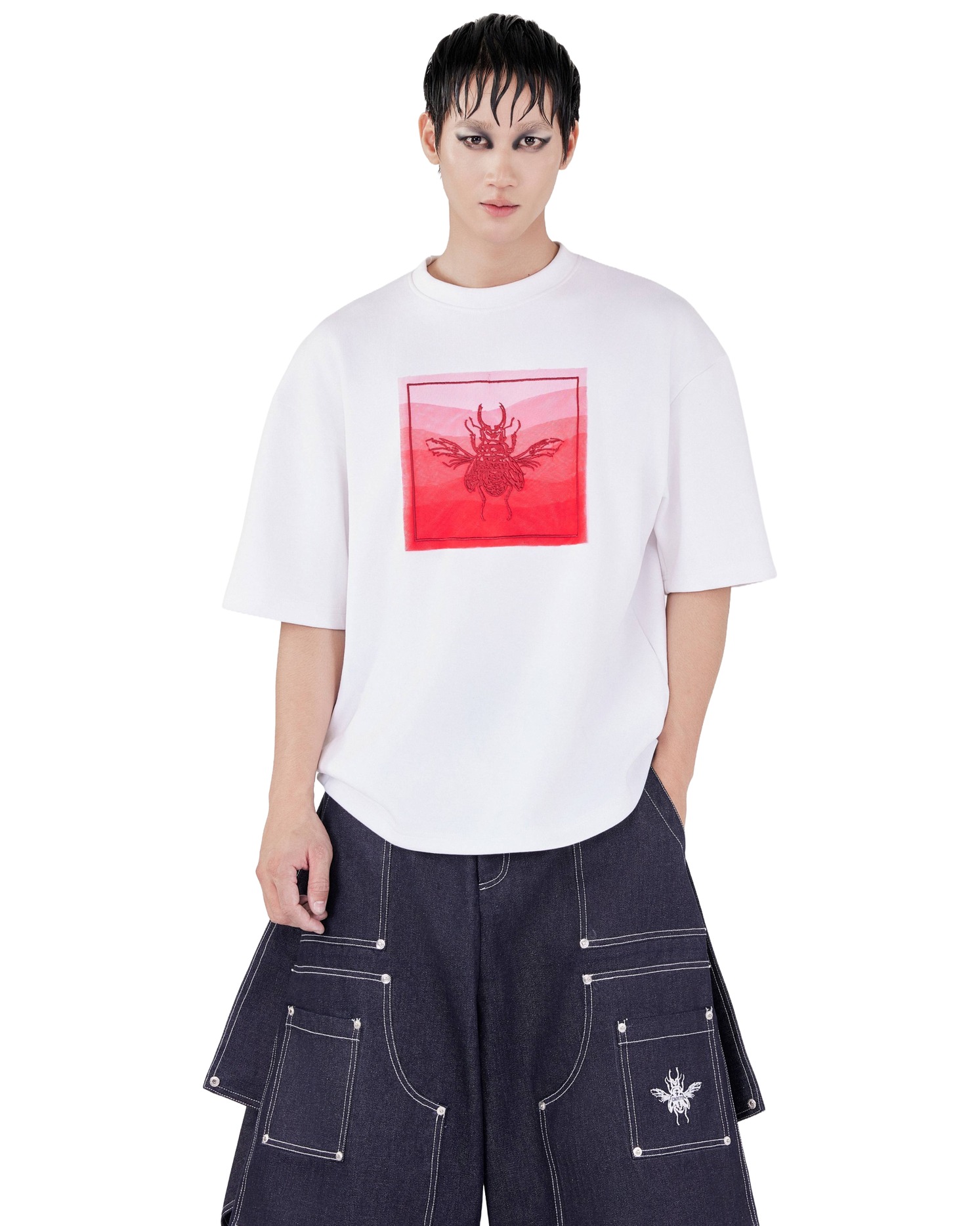 - Bamboo cotton 280 GSM, Beetle motif embroidered in tatami technique at the center, framed with an ombre gradient square.