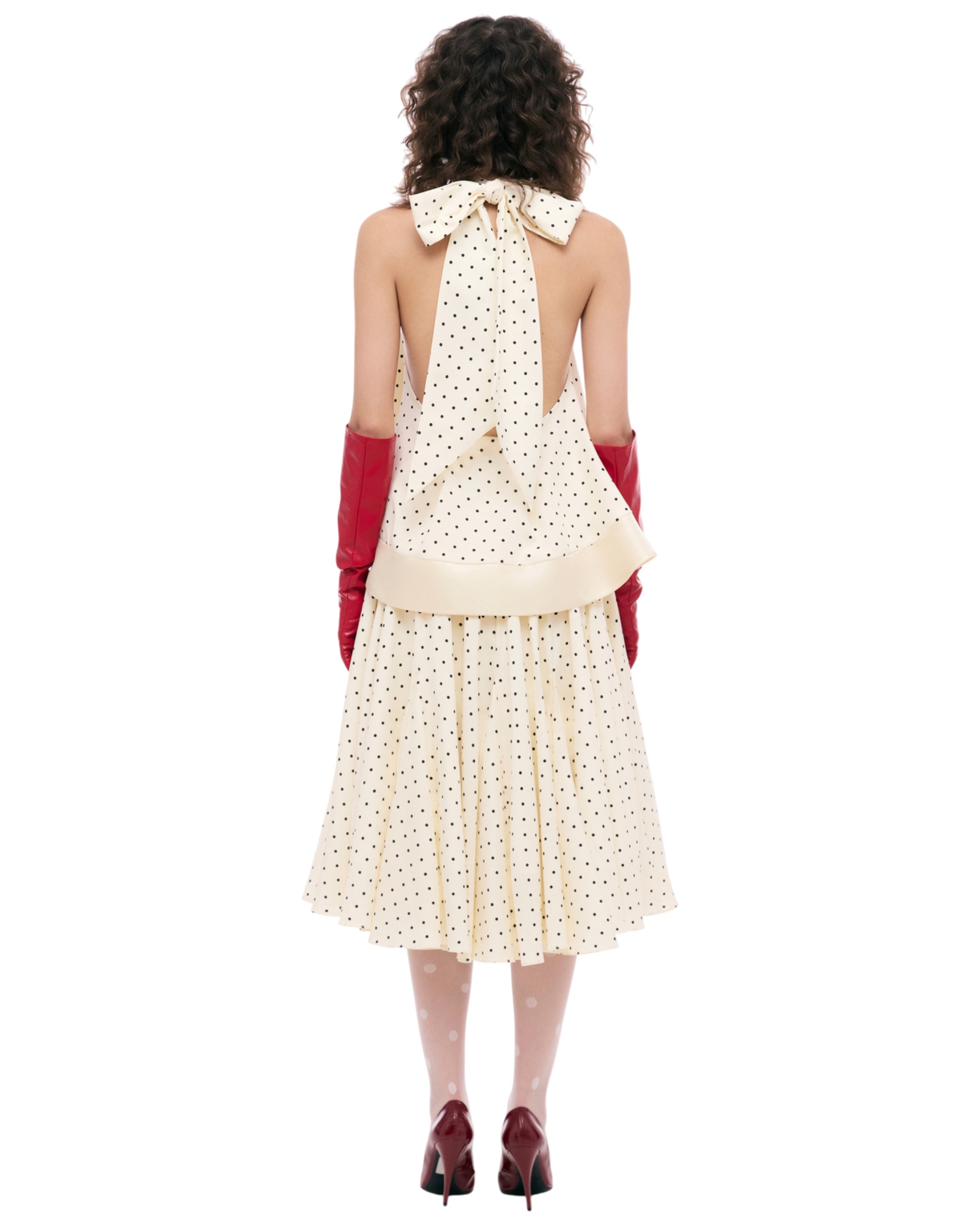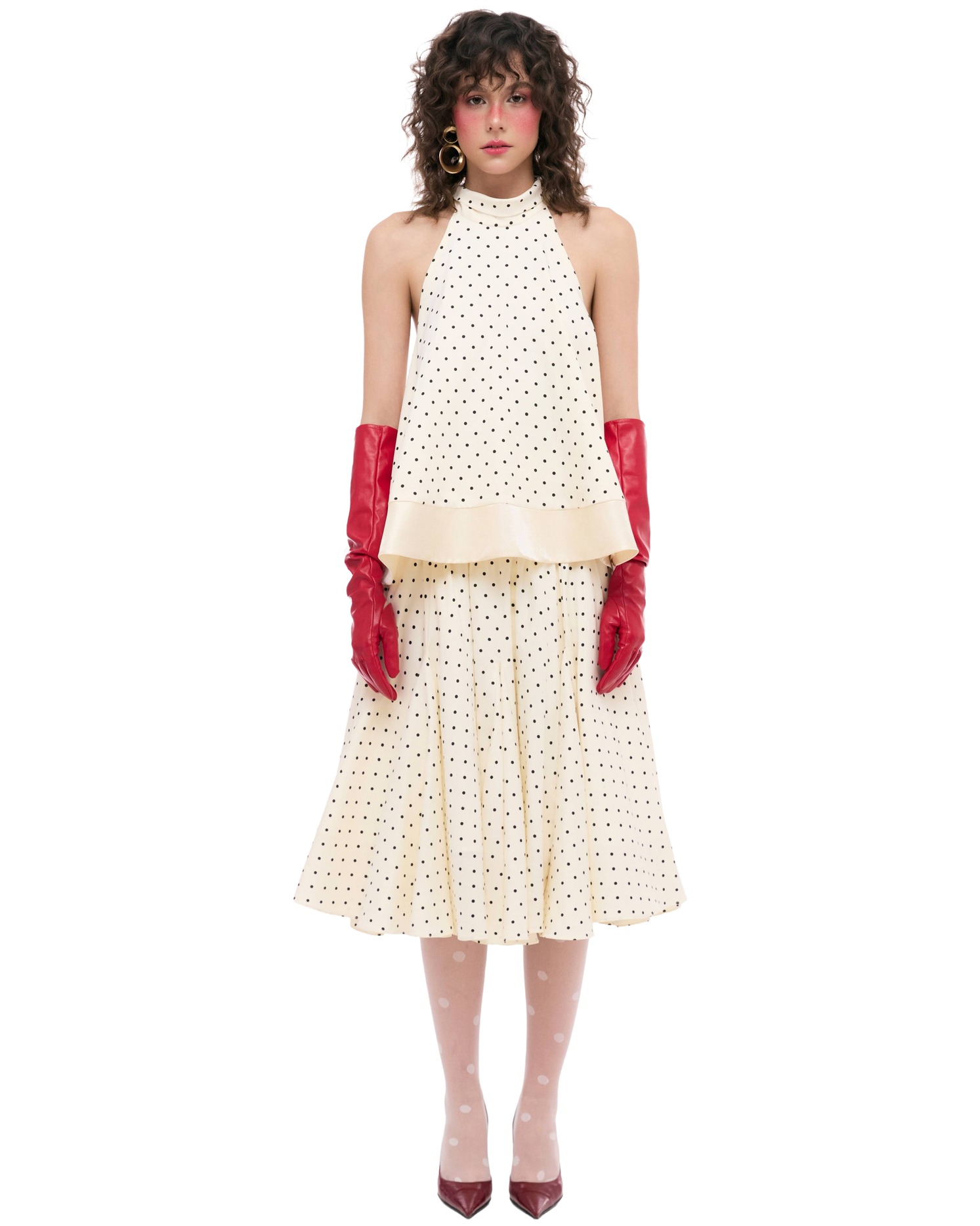 - Polka-dot halter top with a flared silhouette, creating a light and feminine shape.
